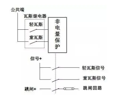 由油、氣、溫等非電氣量組成的變壓器保護稱為非電氣保護。主要包括瓦斯保護、壓力保護、溫度保護、油位保護和冷卻器全停保護。非功率保護根據(jù)現(xiàn)場需要跳閘或發(fā)送信息。