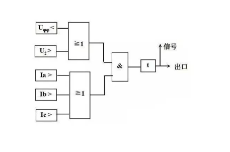 復合電壓過流保護由復合電壓元件、過流元件和時間元件組成。保護接入電流為變壓器本側(cè)CT二次三相電流,接入電壓為變壓器本側(cè)或其他側(cè)PT二次三相電壓。對于微機保護,本側(cè)電壓可以通過軟件提供給其他側(cè),以確保任何一側(cè)的PT維護仍然可以使用復壓過流保護。如下圖所示,動作邏輯。