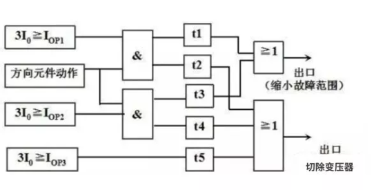 如圖所示,零序方向電流保護I段或II段動作后,首先通過短延時t1或t3跳母聯(lián)或跳本側(cè)開關,以縮小故障影響范圍,如果故障量仍然存在,則通過長延時t2或t4跳三側(cè)開關切除變壓器。無方向的III段,通過延遲直接切除變壓器。