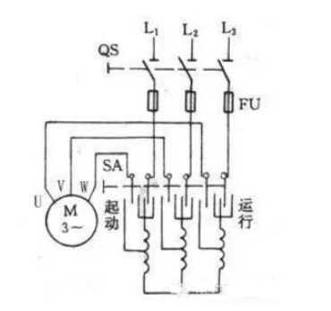 起動時,將轉(zhuǎn)換開關(guān)SA擰到“啟動”位置,此時電機定子繞組與自耦變壓器的低壓側(cè)連接,電動機降壓啟動,待轉(zhuǎn)速上升到一定值時,再將SA擰緊,電機定子繞組與自耦變壓器的低壓側(cè)連接,電機定子繞組啟動。