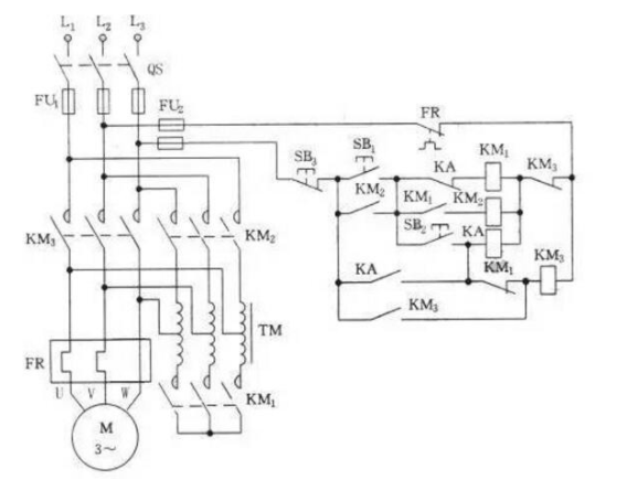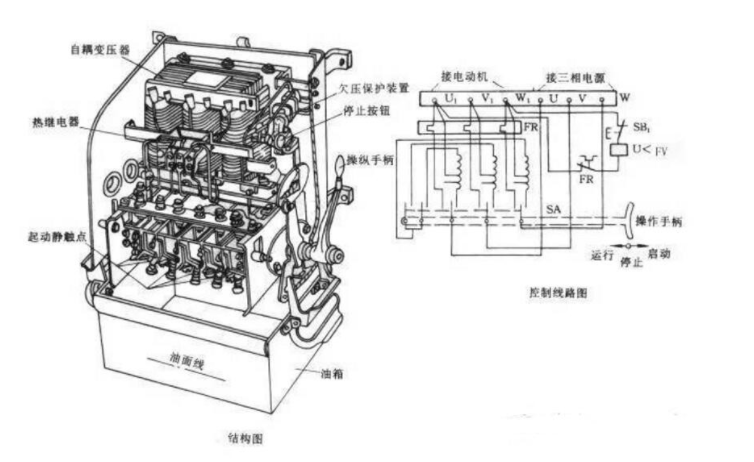 采用手動控制的補償器主要有QJ3。QJ3型起動補償器結(jié)構(gòu)圖和控制線路圖如下: