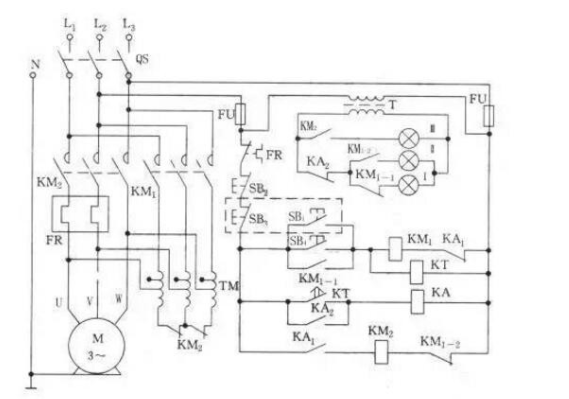 控制器:由KM1,KM2,KM2接觸器,KT,中間繼電器KA和SB1、SB4和起動按鈕SB2、SB3組成。二個啟動按鈕并聯(lián),兩個停機按鈕串聯(lián)組成了兩地控制功能。SB1、SB3(虛線框)組成了甲地控制的啟動,停止按鈕。SB4,SB2組成了控制的啟動,停止按鈕。