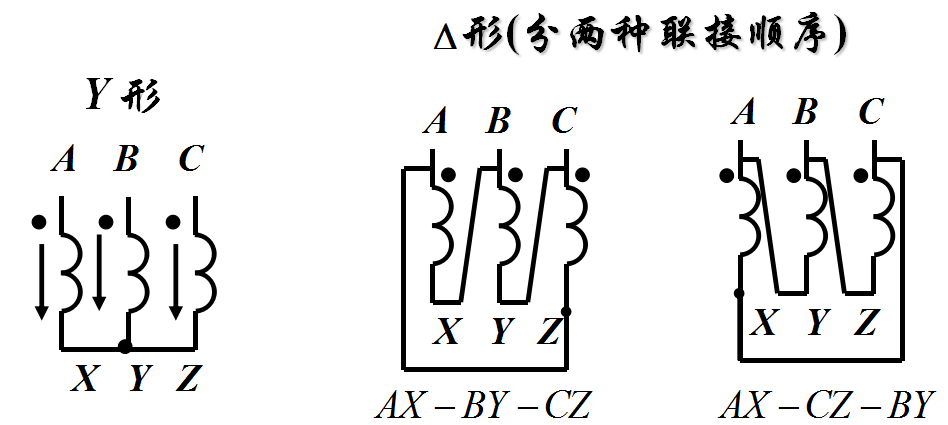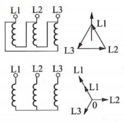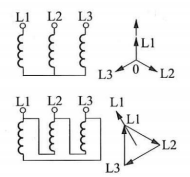 三相變壓器常用的繞組連接組有三角形、星形和曲折形。大寫(xiě)字母Y、D、Z用于高壓繞組,中低壓繞組用同一字母的小寫(xiě)形式Y、D、Z用YN(yn)或ZN(zn)用于中性點(diǎn)引出的星形或曲折連接。
